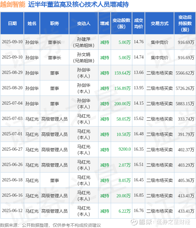越剑智能近半年内的董监高及核心技术人员增减持详情如下: