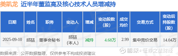 证券之星消息,根据9月10日市场公开信息、上市公司公告及交易所披露数据整理,美凯龙(601828)最新董监高及相关人员股份变动情况:2025年9月10日公司董事会秘书邱喆共减持公司股份4.68万股,占公司总股本为0.0011%。变动期间公司股价上涨1.01%,9月10日当日收盘报3.0元。