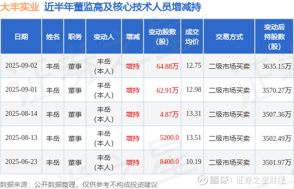证券之星消息,根据9月10日市场公开信息、上市公司公告及交易所披露数据整理,大丰实业(603081)最新董监高及相关人员股份变动情况:2025年9月2日公司董事丰岳共增持公司股份64.88万股,占公司总股本为0.1497%。变动期间公司股价下跌1.08%,9月2日当日收盘报12.84元。