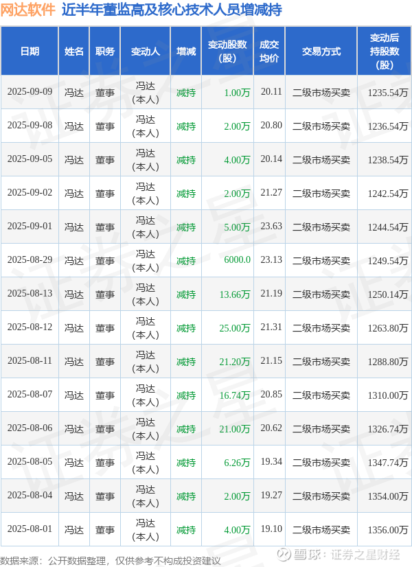 网达软件近半年内的董监高及核心技术人员增减持详情如下: