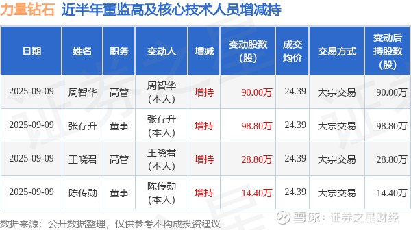 证券之星消息,根据9月10日市场公开信息、上市公司公告及交易所披露数据整理,力量钻石(301071)最新董监高及相关人员股份变动情况:2025年9月9日公司高管周智华、董事张存升、董事陈传勋、高管王晓君共增持公司股份232.0万股,占公司总股本为0.8914%。变动期间公司股价下跌1.67%,9月9日当日收盘报29.98元。