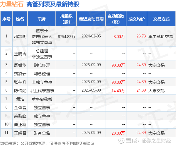 力量钻石近半年内的董监高及核心技术人员增减持详情如下: