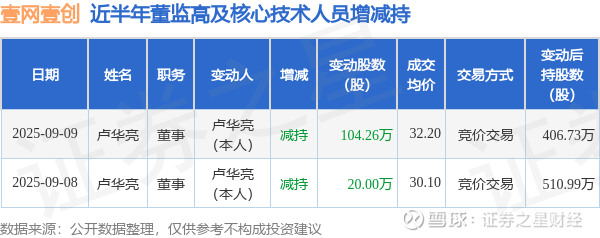 证券之星消息,根据9月10日市场公开信息、上市公司公告及交易所披露数据整理,壹网壹创(300792)最新董监高及相关人员股份变动情况:2025年9月9日公司董事卢华亮共减持公司股份104.26万股,占公司总股本为0.44%。变动期间公司股价上涨8.56%,9月9日当日收盘报32.73元。