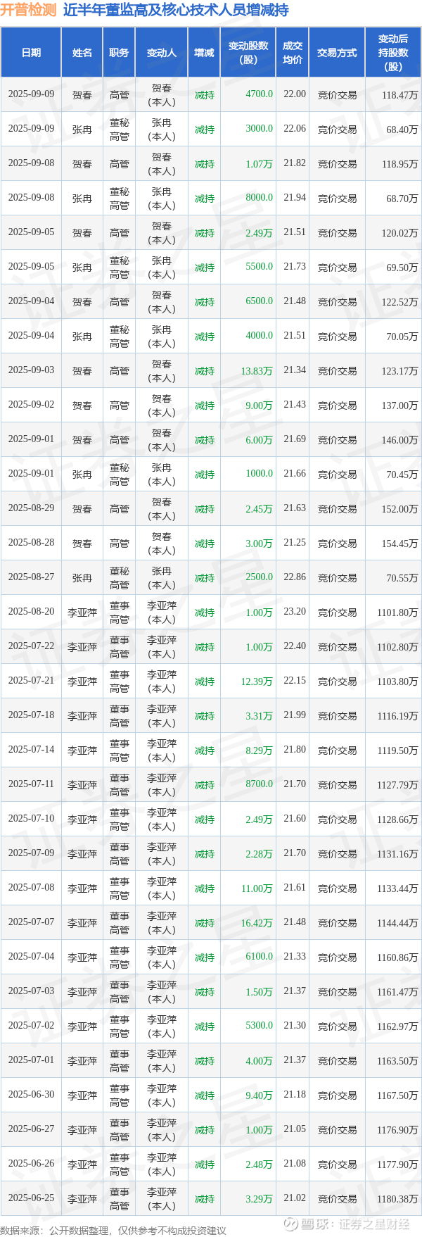 开普检测近半年内的董监高及核心技术人员增减持详情如下: