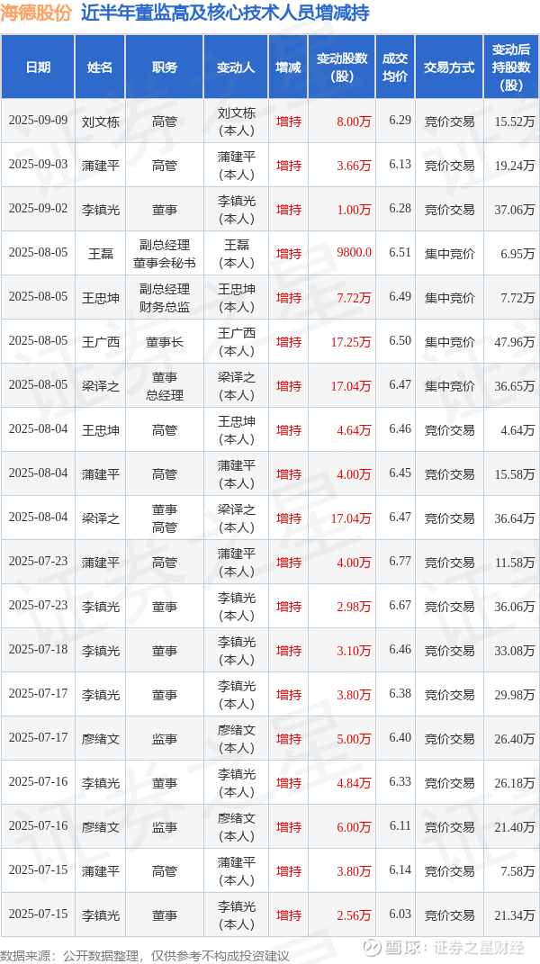 海德股份近半年内的董监高及核心技术人员增减持详情如下: