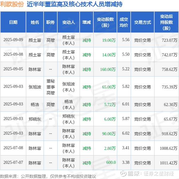 利欧股份近半年内的董监高及核心技术人员增减持详情如下: