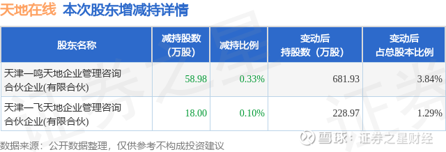 证券之星消息,9月10日天地在线发布公告《天地在线:关于控股股东、实际控制人及其一致行动人权益变动触及1%整数倍的公告》,其股东天津一鸣天地企业管理咨询合伙企业(有限合伙)、天津一飞天地企业管理咨询合伙企业(有限合伙)于2025年9月4日至2025年9月9日间合计减持76.98万股,占公司目前总股本的0.4338%,变动期间该股股价上涨0.39%,截止9月9日收盘报18.12元。
