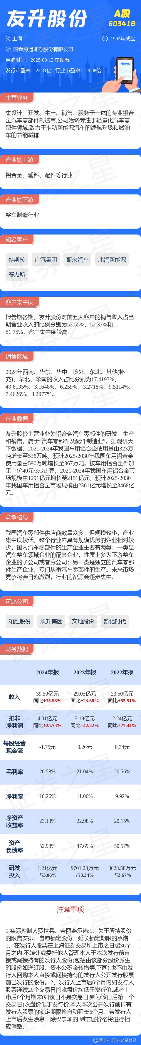 证券之星消息,友升股份9月12日网上申购,申购代码为732418,中签号公布日期为9月16日。该股概况请见下图: