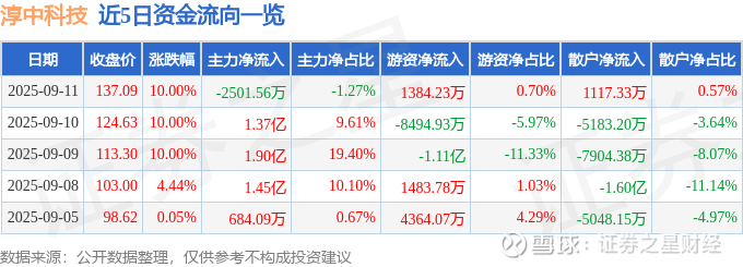 9月11日的资金流向数据方面,主力资金净流出2501.56万元,占总成交额1.27%,游资资金净流入1384.23万元,占总成交额0.7%,散户资金净流入1117.33万元,占总成交额0.57%。