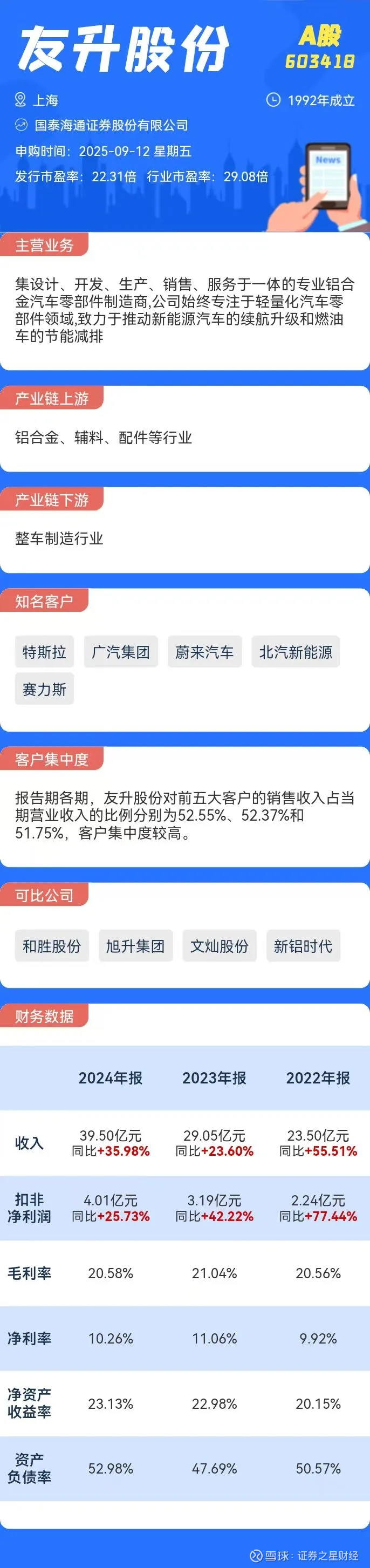 公司业绩方面,2022年至2024年,友升股份实现营业收入分别约为23.50亿元、29.05亿元和39.50亿元,实现净利润分别达到2.33亿元、3.21亿元和4.05亿元。2025上半年,公司实现营业收入21.76亿元,实现净利润2.21亿元。整体而言,公司近年来业绩保持增长趋势。
