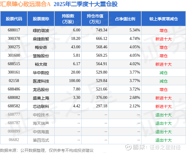 根据2025基金半年报公募基金重仓股数据,重仓该股的公募基金共1家,其中持有数量最多的公募基金为汇泉基金的汇泉臻心致远混合A。汇泉臻心致远混合A目前规模为0.84亿元,最新净值0.5045(9月10日),较上一交易日上涨0.64%,近一年上涨19.32%。该公募基金现任基金经理为梁永强 刘源。梁永强在任的基金产品包括:汇泉策略优选混合A,管理时间为2021年7月20日至今,期间收益率为-41.73%;汇泉兴至未来一年持有混合A,管理时间为2022年4月6日至今,期间收益率为-11.59%。刘源在任的基金产品包括:汇泉兴至未来一年持有混合A,管理时间为2025年6月10日至今,期间收益率为33.87%;