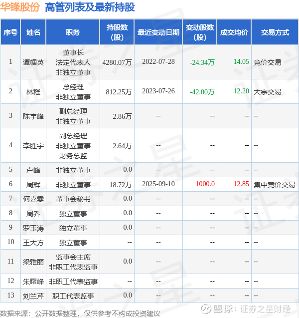 华锋股份近半年内的董监高及核心技术人员增减持详情如下: