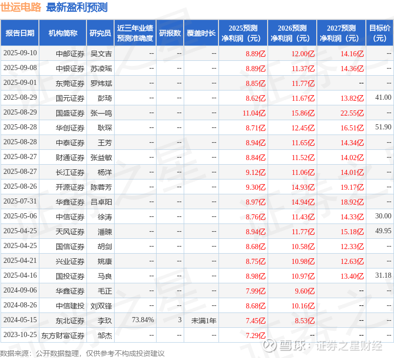 最新盈利预测明细如下:
