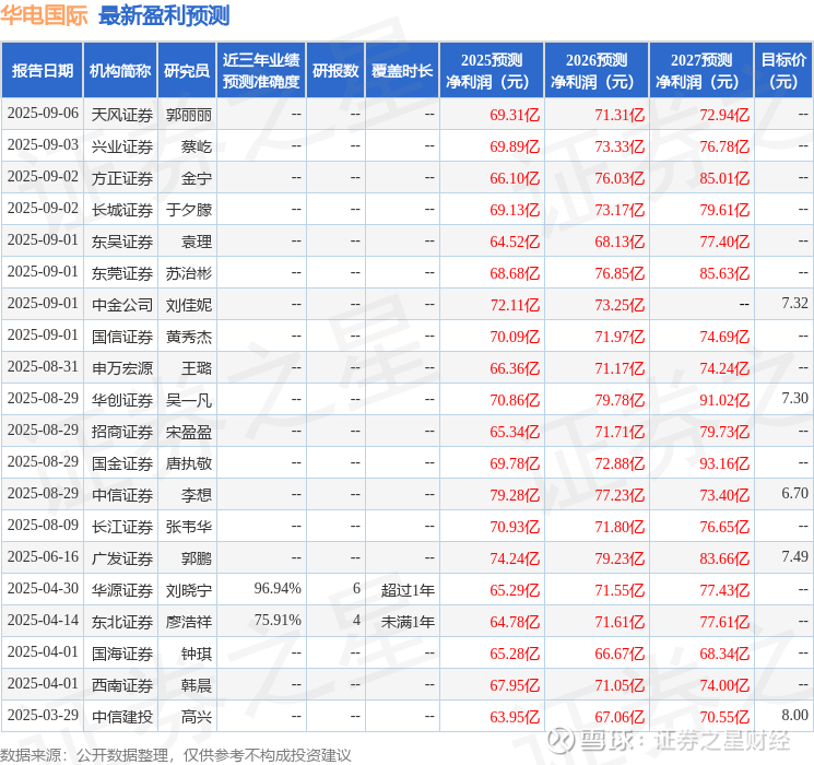 最新盈利预测明细如下:
