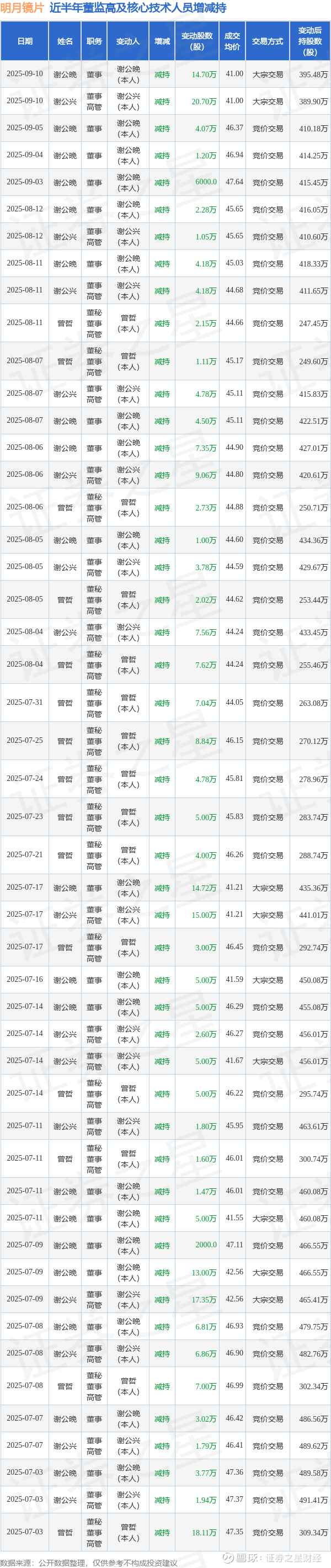 明月镜片近半年内的董监高及核心技术人员增减持详情如下: