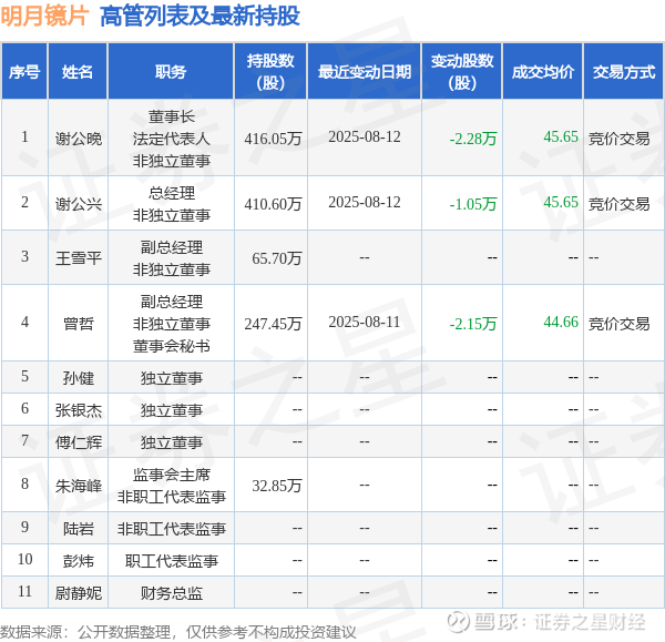 明月镜片的高管列表及最新持股情况如下: