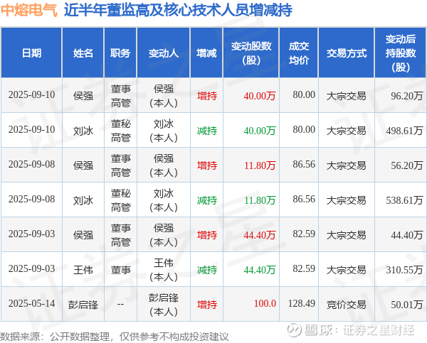 中熔电气近半年内的董监高及核心技术人员增减持详情如下: