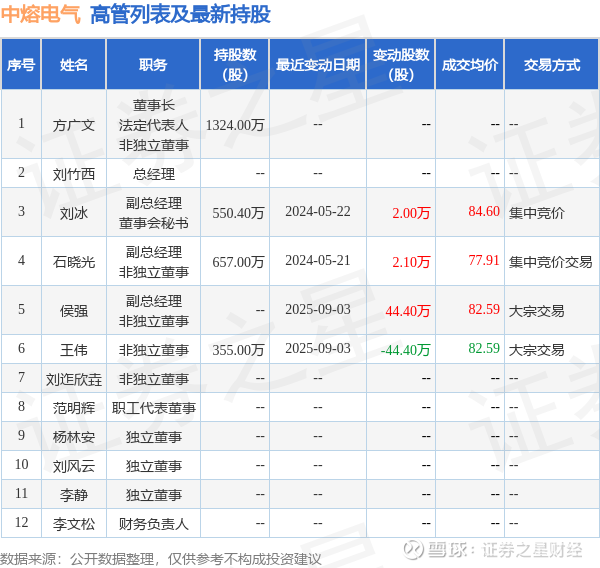 中熔电气的高管列表及最新持股情况如下: