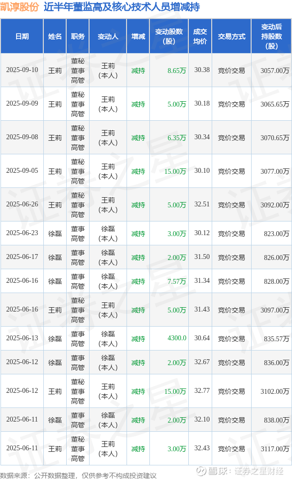 凯淳股份近半年内的董监高及核心技术人员增减持详情如下: