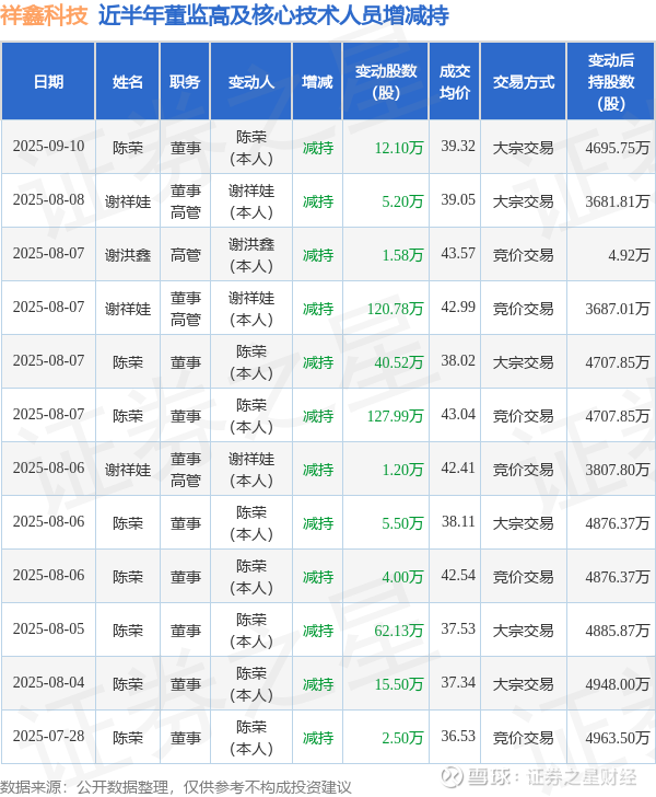 祥鑫科技近半年内的董监高及核心技术人员增减持详情如下: