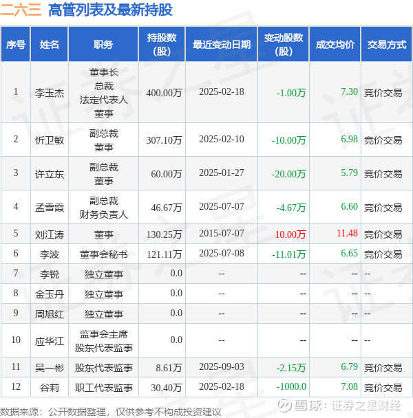 证券之星消息,根据9月11日市场公开信息、上市公司公告及交易所披露数据整理,二六三(002467)最新董监高及相关人员股份变动情况:2025年9月10日公司董秘李波共减持公司股份11.01万股,占公司总股本为0.008%。变动期间公司股价上涨10.08%,9月10日当日收盘报7.32元。