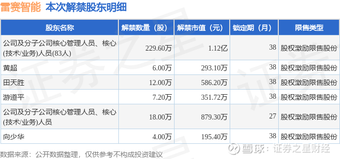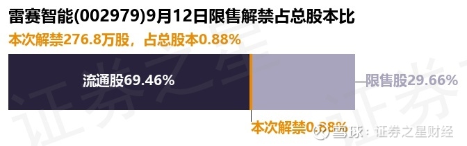 证券之星消息,根据市场公开信息整理,雷赛智能(002979)于9月12日将有276.8万股限售股份解禁,为公司股权激励限售股份,占公司总股本0.88%。(本次数据根据历史公告整理得出,实际情况以上市公司最新公告为准)本次解禁后,公司还有9315.97万股限售股份,占总股本29.66%。具体如下图所示: