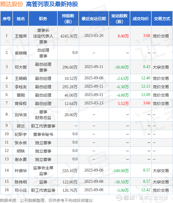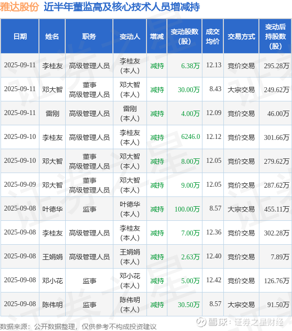 雅达股份近半年内的董监高及核心技术人员增减持详情如下: