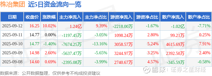证券之星消息,株冶集团9月12日涨停收盘,收盘价16.25元。该股于14点26分涨停,5次打开涨停,截止收盘封单资金为607.42万元,占其流通市值0.05%。