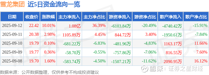 证券之星消息,雪龙集团9月12日涨停收盘,收盘价22.42元。该股于9点57分涨停,1次打开涨停,截止收盘封单资金为3254.49万元,占其流通市值0.69%。