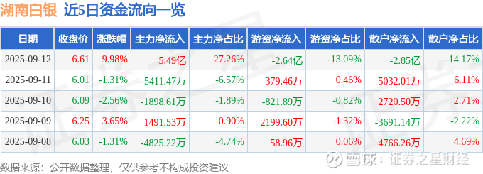证券之星消息,湖南白银9月12日涨停收盘,收盘价6.61元。该股于10点7分涨停,1次打开涨停,截止收盘封单资金为4657.42万元,占其流通市值0.32%。