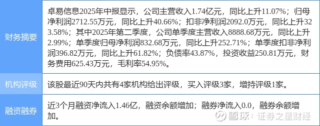 2025年9月1日,民生证券研究员吕伟,郭新宇发布了对卓易信息的研报《2025年半年报点评:AI编程软件龙头,生态完善铸就长期核心竞争力》,该研报对卓易信息给出“买入”评级。研报中预计2025-2027年归母净利润为0.95/1.63/2.76亿元,对应PE分别为89X、52X、31X,维持“推荐”评级。证券之星数据中心根据近三年发布的研报数据计算,该研报作者对此股的盈利预测准确度为77.95%。