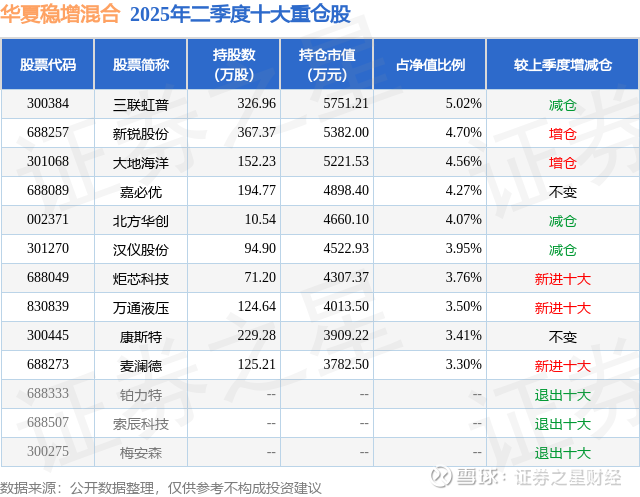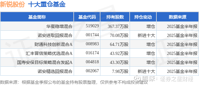 根据2025基金半年报公募基金重仓股数据,重仓该股的公募基金共6家,其中持有数量最多的公募基金为华夏基金的华夏稳增混合。华夏稳增混合目前规模为11.46亿元,最新净值3.166(9月11日),较上一交易日上涨2.03%,近一年上涨84.39%。该公募基金现任基金经理为彭海伟。彭海伟在任的基金产品包括:华夏景气成长一年持有混合发起式A,管理时间为2024年3月28日至今,期间收益率为48.21%。