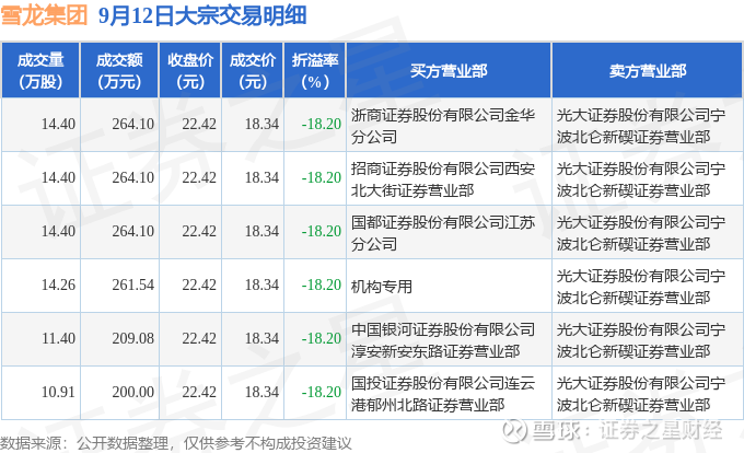 证券之星消息,9月12日雪龙集团发生大宗交易,交易数据如下:
