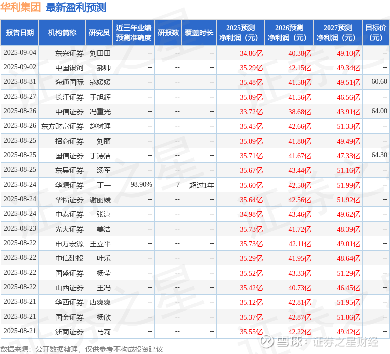 最新盈利预测明细如下:
