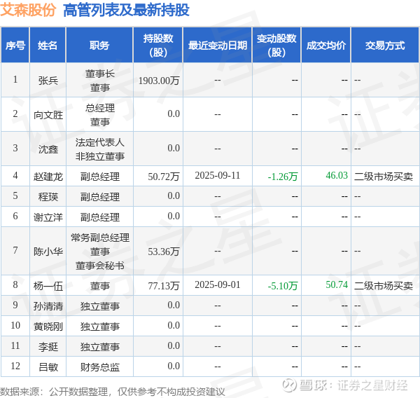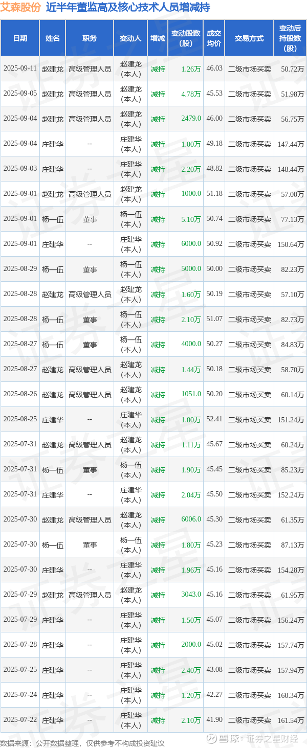 艾森股份近半年内的董监高及核心技术人员增减持详情如下:
