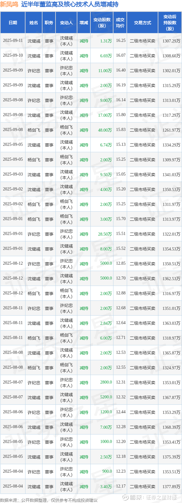 新凤鸣近半年内的董监高及核心技术人员增减持详情如下: