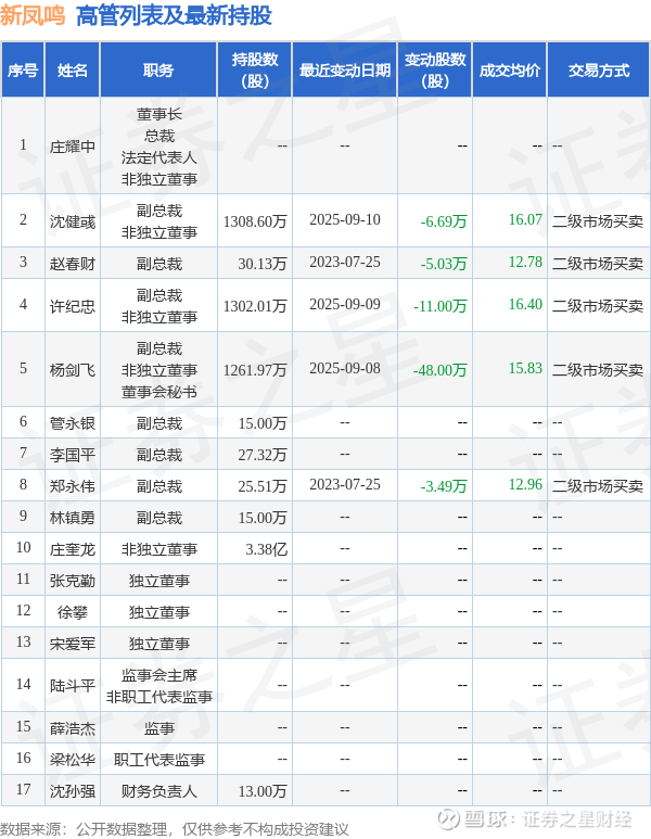 新凤鸣的高管列表及最新持股情况如下: