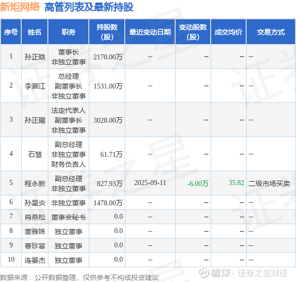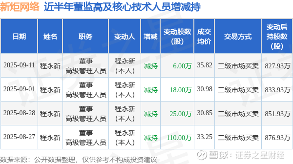证券之星消息,根据9月12日市场公开信息、上市公司公告及交易所披露数据整理,新炬网络(605398)最新董监高及相关人员股份变动情况:2025年9月11日公司董事,高级管理人员程永新共减持公司股份6.0万股,占公司总股本为0.0369%。变动期间公司股价上涨10.01%,9月11日当日收盘报35.82元。
