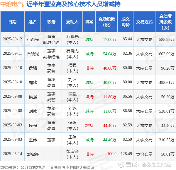 中熔电气近半年内的董监高及核心技术人员增减持详情如下: