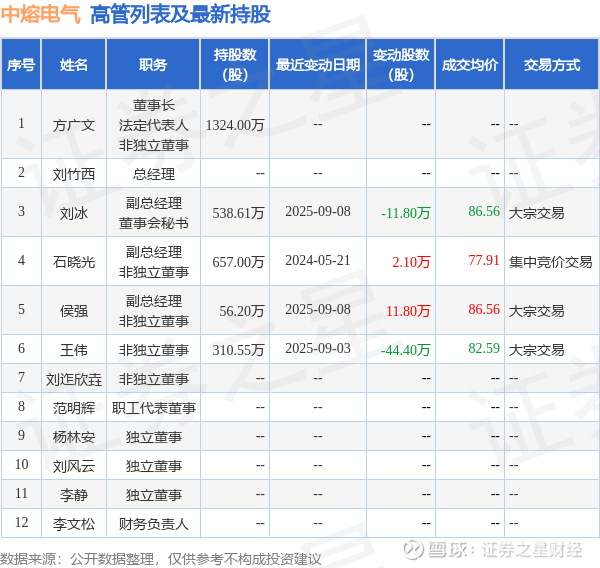 中熔电气的高管列表及最新持股情况如下: