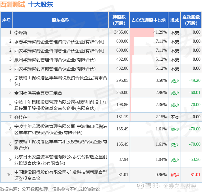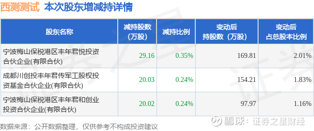 证券之星消息,9月12日西测测试发布公告《西测测试:关于合计持股5%以上股东持股比例降至5%以下的权益变动提示性公告》,其股东宁波梅山保税港区丰年君悦投资合伙企业(有限合伙)、成都川创投丰年君传军工股权投资基金合伙企业(有限合伙)、宁波梅山保税港区丰年君和创业投资合伙企业(有限合伙)于2025年7月25日至2025年9月11日间合计减持69.21万股,占公司目前总股本的0.8199%,变动期间该股股价下跌0.81%,截止9月11日收盘报55.1元。