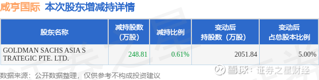 证券之星消息,9月12日咸亨国际发布公告《咸亨国际:简式权益变动报告书》,其股东GOLDMAN SACHS ASIA STRATEGIC PTE. LTD.于2025年9月1日至2025年9月11日间合计减持248.81万股,占公司目前总股本的0.6063%,变动期间该股股价下跌2.16%,截止9月11日收盘报14.05元。
