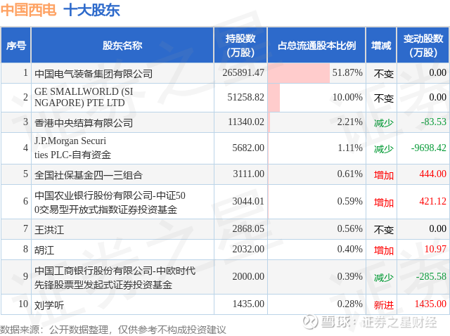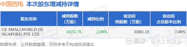 证券之星消息,9月12日中国西电发布公告《中国西电:中国西电关于持股5%以上股东权益变动触及1%刻度及减持计划完成暨减持股份结果的公告》,其股东GE SMALLWORLD (SINGAPORE) PTE LTD于2025年9月11日合计减持10251.76万股,占公司目前总股本的2.0%,变动期间该股股价上涨0.78%,截止9月11日收盘报6.47元。