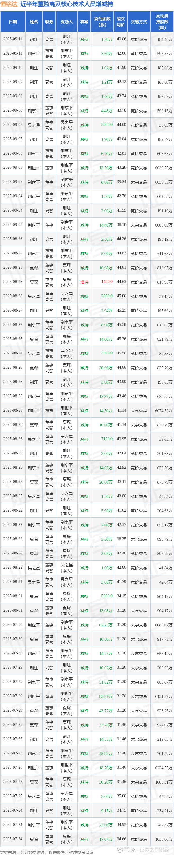 恒铭达近半年内的董监高及核心技术人员增减持详情如下: