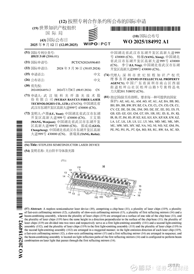 证券之星消息,根据企查查数据显示锐科激光(300747)公布了一项国际专利申请,专利名为“无台阶半导体激光器”,专利申请号为PCT/CN2024/096403,国际公布日为2025年9月11日。