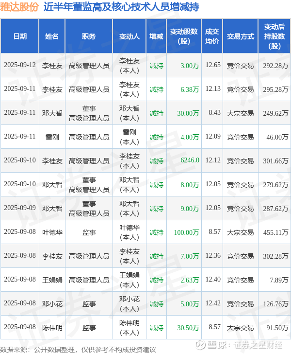 雅达股份近半年内的董监高及核心技术人员增减持详情如下: