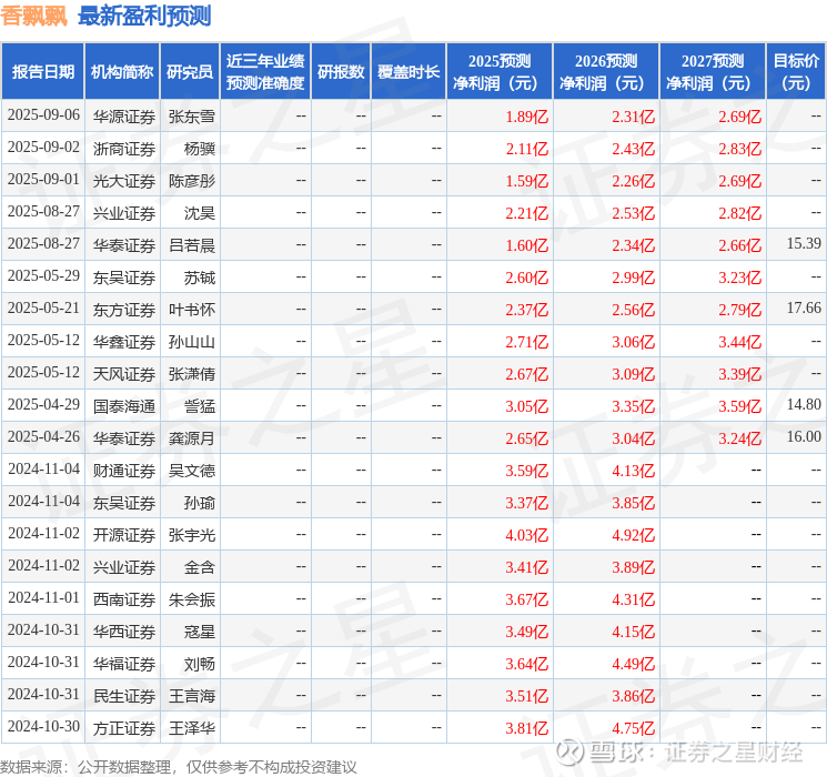 天风证券股份有限公司张潇倩,谢文旭近期对香飘飘进行研究并发布了研究报告《H1即饮板块贡献核心业绩,全年业绩预计以稳为主》,给予香飘飘买入评级。