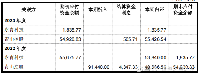 背靠“青山系”,麦田能源获得了实打实的资金支持。麦田能源曾向永青科技和青山控股借款用于资金周转,公司解释称系前期资金实力有限,而生产采购、产品研发、日常运营等资金需求较大,存在一定资金缺口。2023年初,麦田能源对永青科技及青山控股的应付资金分别为1835.77万元、5.49亿元,在结算利息后于当年归还。