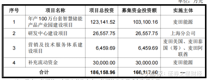 招股书显示,麦田能源此次IPO募资拟分别投向年产100万台套智慧储能产品产业园建设项目(下称智慧储能产品项目)、研发中心建设项目、营销及技术服务体系建设项目、补充流动资金,拟投入募资额分别为10.31亿元、2.66亿元、6459.69万元、3亿元。
