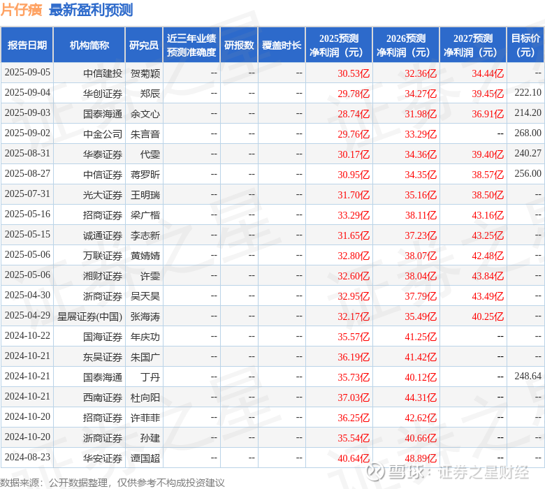 最新盈利预测明细如下: